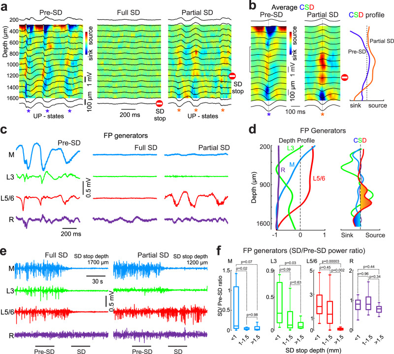 a Example traces of FP (black) at different cortical depths overlaid on current-source density (CSD) map in pre-SD epoch (left), during full SD (middle) and partial SD terminated at depth of 1200 μm (right). b Average UP-states of δ-oscillations during pre-SD epoch and partial SD (left), and corresponding CSD values at the peak of the UP-states (right). c Example traces of the four main FP generators obtained by the independent component analysis (ICA) of FP profiles. d Left, Characteristic spatial profile (left) of each component of the FP generator (Main (blue), L3 (green), L5/6 (red) and Remote (purple)). Right, the second derivative of the spatial profiles (right) as an analog of CSD. e The time course of each of the generators during a full SD (left) and partial SD (right) stopped at a depth of 1200μm. f Grouped data from 11 rats (n = 180 SDs) presented as boxplots [center line, median; edges, Q1/Q3; whiskers, non-outlier extremes] for the SD/pre-SD power ratio (values < 1 correspond to a depression, >1 refers to a boom) for each of the generators at three ranges of SD stop depth: less than 1 mm (surface Partial SDs), between 1 and 1.5 mm (intermediate Partial SDs), and deeper than 1.5 mm (Full SDs), Kruskal-Wallis test. Source data are provided as a Source Data file.