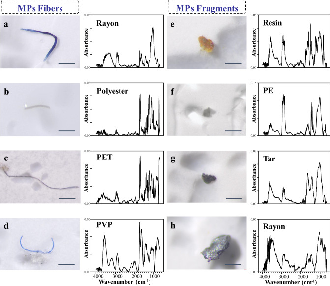 Stereomicroscope images are shown in the 1st and 3rd columns and the corresponding micro-FTIR spectra are provided in the 2nd and 4th columns. MPs fibers (panels a–d); MPs fragments (panels e–h). PET: polyethylene terephthalate, PVP polyvinyl propionate, Resin epoxy resin ester, PE polyethylene, Tar sealant tar. Scale bar: 200 μm. The source data underlying (a–h) are provided in a Source Data file.