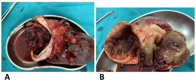 Figure 5. Macrospecimen of an aneurysm of the splenic artery in section. (A) The contents of the aneurysm; (B) aneurysm cavity.