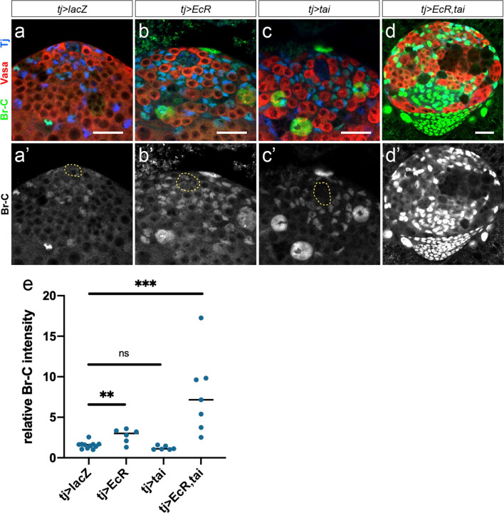 (a-d) Br-C expression in LL3 control testes upon somatic over-expression of EcR (b), Tai (c), or EcR and Tai simultaneously (d). (e) Quantification of relative Br-C intensity from a-d. Scale bars = 25 μm.