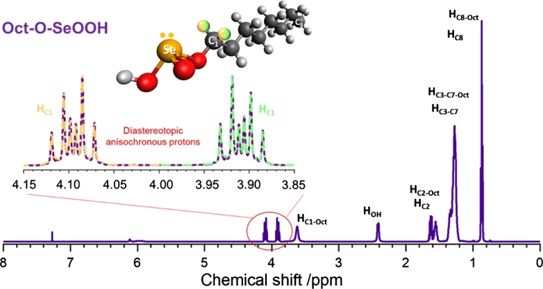 ), showing the anisochronous chemical shift (splitting of peaks onto two regions around 3.9 and 4.1 ppm). Based on the Se chiral environment, these signals infer the formation of alkyl acid selenites (Oct–O–SeOOH). The structure of the Oct–O–SeOOH molecule is also shown, highlighting the diastereotopic protons. Concerning the stoichiometric ratio
