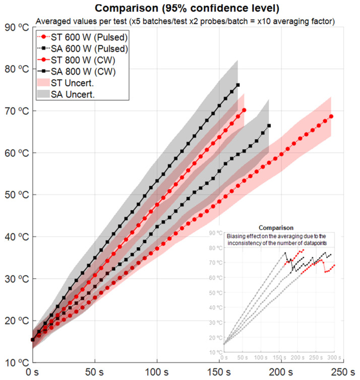 Temperature evolution per specimen and power profile (averaged values) and uncertainty associated (95% confidence level). Embedded subfigure shows the avoided biasing effect on the average that would have introduced the data dispersion when considering a non-constant number of datapoints (see Figure 2).