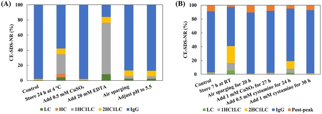 CE-SDS-NR results of samples under different conditions. (A) mAb molecule (pI = 7.2, Mw = 144 kDa). (B) BsAb molecule (pI = 7.8, Mw = 175 kDa).
