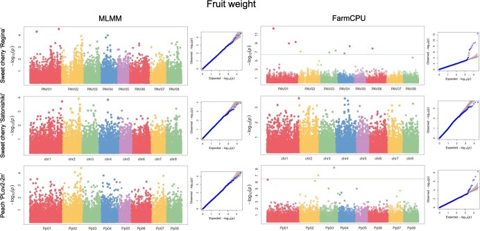 Sequencing of the prepared GBS libraries of the panel resulted in 389 682 215 raw reads with an average of 7.9 million reads per sample (Supplementary Data Fig. S2), which were aligned to three reference genomes. Alignment on the P. avium var. ‘Regina’ reference genome and variant calling yielded a total of 574 556 SNPs (Supplementary Data Table S1). After removing SNPs based on minimum quality, depth, and <20% missing data to ensure a high-quality SNP set for GWAS, we retained 75 916 SNPs. After filtering for >5% minor allele frequency (MAF), GWAS was conducted with 28 198 SNPs. The same filtering method was applied after alignment on P. avium var. ‘Satonishiki’ and Prunus persica ‘PLov2-2n’ genomes, and we retained 34 864 and 33 760 SNPs, respectively (Supplementary Data Table S1).