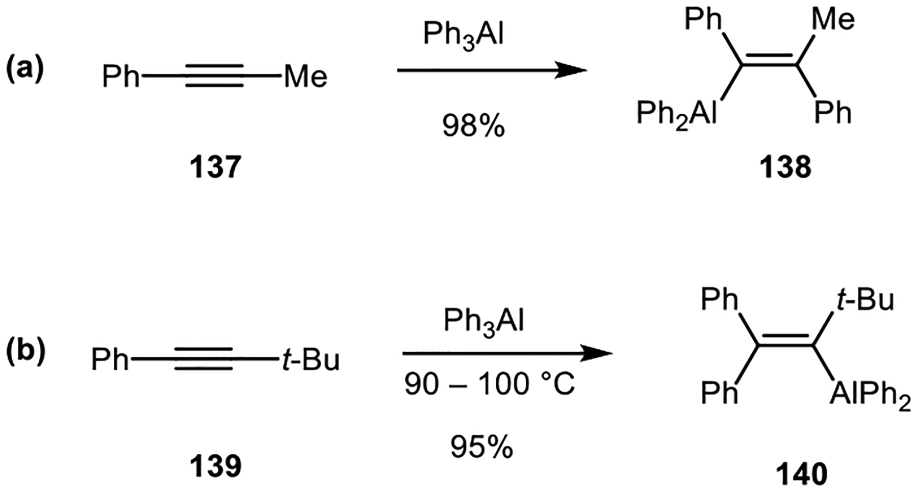 Another limitation of the uncatalyzed carboalumination of alkynes is the considerable amount of products formed from β-H elimination side reactions. When tricoordinate aluminum reagents have C–H bonds β to the aluminum atom, as is the case for triisobutylaluminum, dialkylaluminum hydrides are formed in situ, and these compounds underwent hydroalumination instead of carboalumination (Scheme 34a).18, 87 Carboalumination also does not occur with terminal alkynes, which instead undergo metalation at the terminal C–H bond (Scheme 34b).88