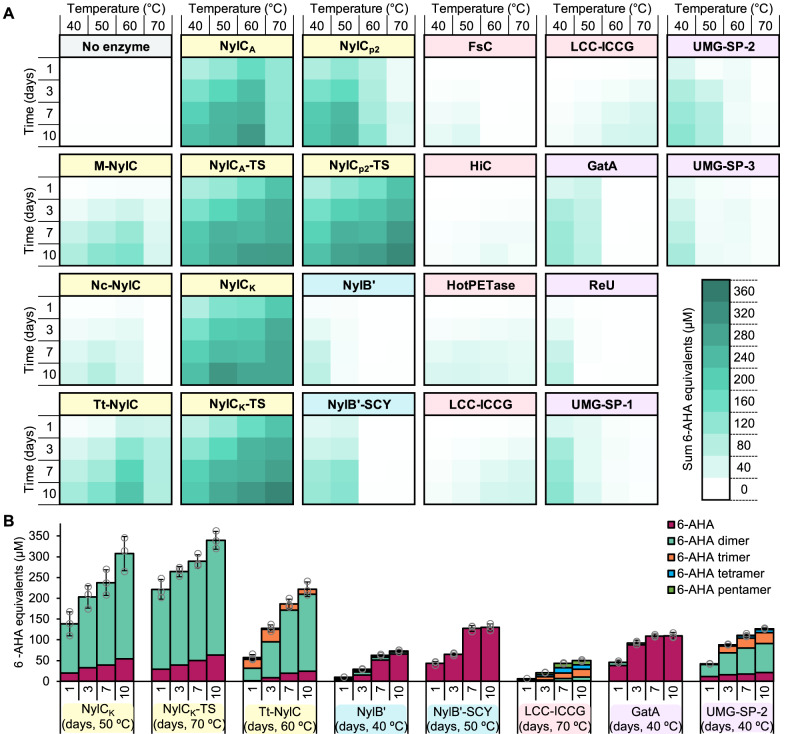 A Heat map time-course profiles of the total released (sum) 6-AHA monomer equivalents following PA6 depolymerization reactions with the top performing NylC-type (yellow), NylB-type (blue), SHD-hydrolase (pink), and amidase (purple) enzymes, carried out from 40 to 70 °C over 10 days. The heat map gradient represents the released 6-AHA monomer equivalents from 0 to 360 µM, with each square representing the average of reactions carried out in triplicate (n = 3). (Full enzyme names and sources are in Supplementary Data 1.) B Representative depolymerization reactions with enzymes from each group at their optimal temperatures (reactions conducted between 40 and 70 °C, x-axis), with 6-AHA oligomers of different lengths represented as their 6-AHA monomer equivalents. Reactions were carried out in triplicate (n = 3), error bars show the standard deviation of the replicate measurements, the error bar centers are the means of the replicate measurements, and the replicate measurements are represented as gray circles. For all data in (A) and (B), the reactions contained 2 µM enzyme and 13 mg PA6 (0.15 mM enzyme/g PA6, 0.65 wt% substrate loading) and were incubated in reaction buffer (100 mM NaPi buffer, pH 7.5, 150 mM NaCl). Source data are provided in the Source Data file.