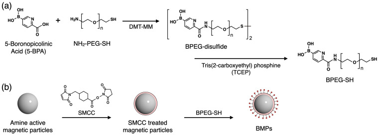 (a) Synthesis of 5-BPA–terminated PEG (BPEG-SH). (b) Preparation of BMPs.