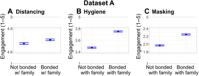 Family bonding is related with higher engagement in (A) distancing, (B) hygiene, and (C) mask wearing in dataset A. In all graphs, the horizontal bars show SEMs.