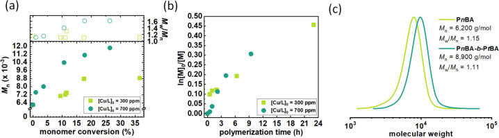 Chain extension experiments of PnBA by PtBA in Cyrene via SARA ATRP varying catalyst concentration. (a) First-order kinetics plots of monomer conversion vs polymerization time and (b) Mn and Mw/Mn vs monomer conversion. (c) GPC traces of PnBA before and after chain extension by PtBA using 300 ppm (Table S4).