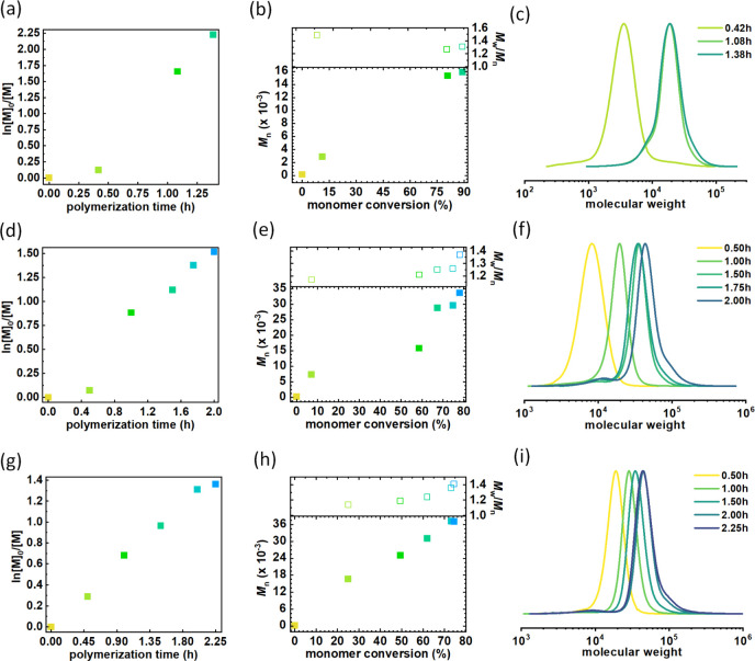 (a, d, g) First-order kinetics plots of monomer conversion vs polymerization time, (b, e, h) Mn and Mw/Mn vs monomer conversion, and (c, f, i) GPC traces of polymers synthesized by polymerization of nBA via SARA ATRP in Cyrene from functionalized riboflavin (Table 2, entry 1), troxerutin (Table 2, entry 2), and β-cyclodextrin (Table 2, entry 3).