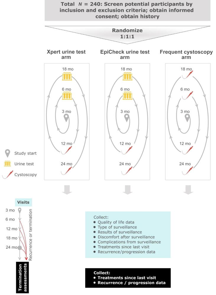 According to the PICOTS principle, this study addresses the following research question: in patients undergoing surveillance for low-grade intermediate-risk NMIBC (population), does programmatic surveillance in which cystoscopy is alternated with either the Xpert Bladder Cancer Monitor or Bladder EpiCheck tests (interventions) compared with frequent cystoscopic surveillance at 6, 12, 18, and 24 mo (comparator) decrease the burden of surveillance (significantly better urinary quality of life; outcomes) when started 3 mo after tumor resection (timing) in diverse outpatient urology practices (setting)?