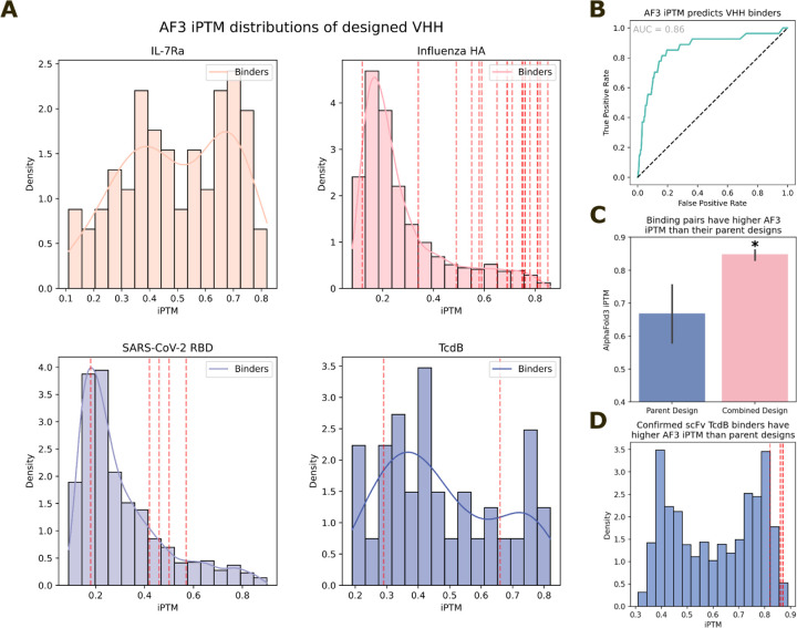 Secondly, we predicted the structures of the SARS-CoV-2, influenza HA, TcdB and IL-7R designs using AF3 with a multiple sequence alignment (MSA) and template for the target and only a template for the VHH (since CDRs are de novo, we reasoned the MSA would be of limited utility). We analyzed the predictions for libraries with at least one structurally validated VHH (TcdB, influenza HA and SARS-CoV-2). These results are dominated by anti-HA VHHs as the majority of successful binders came from this library. We find that the AF3 iPTM score is predictive of binding success (AUC = 0.86, Extended Data Fig. 18A–B). Overall, only 9% of our ordered VHH designs have an iPTM score > 0.6 suggesting that success rate will be improved by incorporation of an iPTM filter. We ran a similar analysis for the combinatorially-assembled scFv libraries; we predicted the structures of the parental scFv designs (before combinatorial assembly) and the experimentally-confirmed scFv designs (combinatorially-assembled) using AF3 with an MSA for the target sequence and a template for the target as well as the heavy and light chains, taking the max iPTM score over 10 seeds. We find that successful designs cluster to higher AF3 iPTM scores than the parental designs (Extended Data Fig. 18C). Only 4% of the initial design library has iPTM > 0.85 while 5 out of the 6 experimentally-confirmed designs pass this threshold, again suggesting that filtering by AF3 iPTM should increase success rates (Extended Data Fig. 18D).