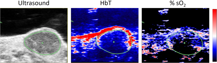 Unlike Computed Tomography (CT), Magnetic Resonance Imaging (MRI) and Positron Emission Tomography (PET), US-PAI is relatively inexpensive and does not require the administration of radioactive isotopes or exogenous imaging agents, making it a safe and desirable approach for longitudinal imaging.3 While oxygen-sensitive electrodes have also been commonly used to measure oxygen partial pressure (pO2) in tumors in vivo; these probes are invasive and suffer from limited sampling of the tumors. In contrast, the three dimensional nature of PAI allows for assessment of temporal and spatial mapping of hypoxia within the entire tumor.6 Given these advantages, US-PAI is currently being evaluated for applications in oncology, including detection of breast cancer7 (ClinicalTrials.gov ID NCT03897270 and NCT04437030).
