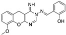 (3E) 3-N-(Phenylmethylidene)amino-4-imino-3,5-dihydro-4H-chromeno[2,3-d]pyrimidine (10f). According to the standard procedure, 10f was synthesized, respectively, from 3-amino-4-imino-3,5-dihydro-4H-chromeno[2,3-d]pyrimidine 8b (2.05 mmol) and commercial benzaldehyde 9b (261 mg, 2.46 mmol, 1.2 equiv.) in 30% yield as yellowish powder; mp = 232–234 °C. IR (KBr, ν, cm−1): 1520 (C=C); 1638 (C=N); 3199 (NH). 1H NMR (DMSO-d6) δ: 4.01 (s, 2H, CH2); 6.93 (dd, 2H, J = 7.1, 4.4 Hz, H-7, H-8); 7.14 (d, 1H, J = 8.1 Hz, H-9); 7.17 (d, 1H, J = 8.2 Hz, H-4′); 7.28 (m, 4H, H-2′, H-3′, H-5′, H-6′, Ar); 7.52 (d, 1H, J = 7.8 Hz, H-6, Ar); 8.34 & 8.56 (s, 2H, N-CH=N, CH=N); 11.02 (br s, 1H, NH). 13C NMR (DMSO-d6) δ: 22.8 (C-5, CH2); 93.6 (C-4a); 116.9 (C-9, Ar); 117.1 (C-5a); 119.6 (C-7, Ar); 119.7 (C-2′, C-6′, Ar); 124.9 (C-3′, C-5′, Ar); 128.7 (C-8, Ar); 129.7 (C-6, Ar); 129.8 (C-4′, Ar); 131.2 (C-1′, Ar); 150.3 (C=NH); 157.0 (N-C=N); 157.7 (C-9a); 158.4 (C-10a); 163.2 (C=N). HRMS (ES+, MeOH/CH2Cl2 9:1), m/z: 303.1239 found (calculated for C18H15N4O, [M+H]+ requires 303.12404).