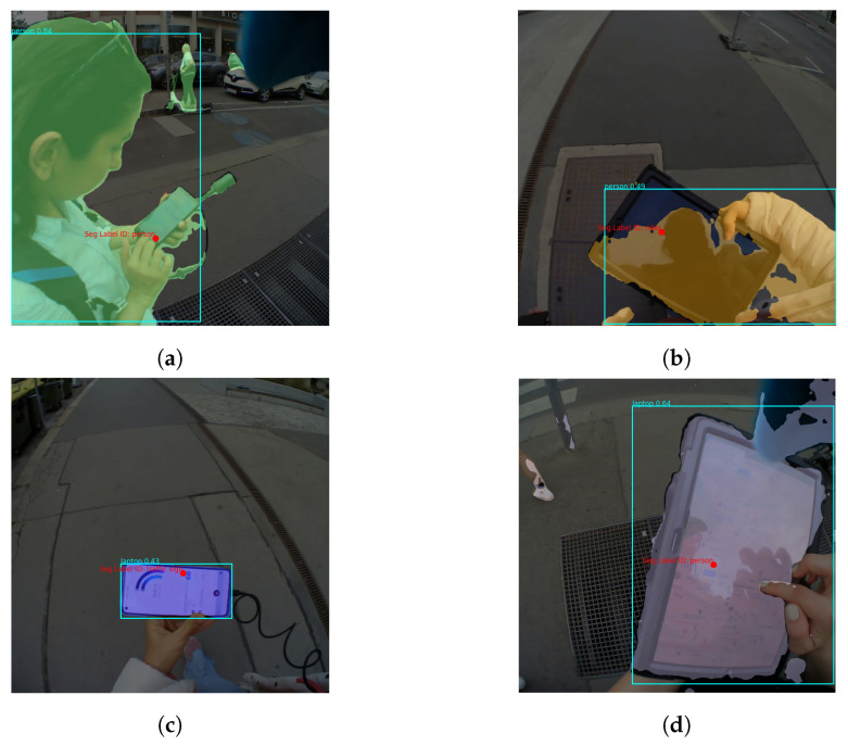 Example frames of cases where YOLO confuses handheld devices. (a) A cell phone held by the experimenter causes YOLO to confuse the person holding the phone with the phone, especially if the fixation point is at the edge of these two objects. (b) The reflection of the person on the black screen of the tablet due to the lighting conditions confuses YOLO and leads to incorrectly recognizing the person. (c) Cell phone held in landscape orientation is recognized as a laptop by YOLO. (d) A 12.4-inch tablet device showing a map to the user is misclassified as a laptop by YOLO.