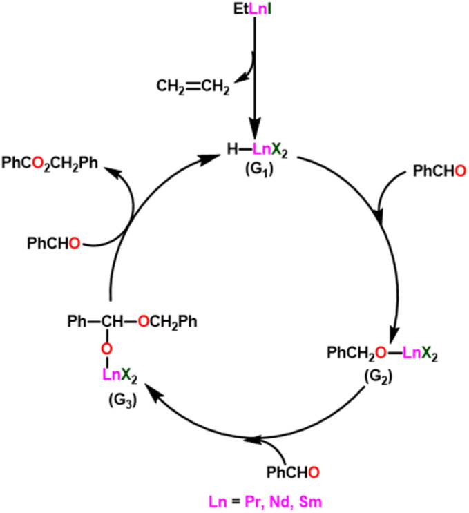 Inner transition organometallic compounds have emerged as promising alternatives to traditional transition metal complexes, owing to a need for novel catalysts and the unique properties of actinides and lanthanides. Recent research has focused significant emphasis on the development of organoactinide and organolanthanide complexes as catalysts for Tishchenko reactions. This increased interest stems from their advantageous properties, including high Lewis acidity, high coordination numbers, relatively polar metal–ligand bonding, a tunable coordination sphere around the metal center, a plethora of coordination geometries, and environmental friendliness. The steric and electronic properties of auxiliary ligands employed in organo-f-element complex-mediated organic transformations have a significant influence on the catalytic activity exhibited by the organo-f-element complex systems.51–53 The distinctive reactivities of organoactinide and organolanthanide compounds often complement those observed in the main group and, transition metal. An example of this is the fact that, unlike the anti-Markovnikov addition products generated by transition metal precatalysts, actinide complexes showed Markovnikov selectivity when hydrothiolating terminal alkynes.54,55 The prevalence of unique oxidation states (+3 in lanthanides and +4 in early actinide (Th)) precludes the conventional catalytic routes of oxidative addition and reductive elimination commonly observed in transition-metal complexes. Consequently, organoactinide and organolanthanide-induced transformations are primarily characterized by olefin insertion and metathesis, respectively.56–60 The strong affinity of actinide and lanthanide centers for oxygen-containing substrates posed a significant challenge in organo-f-chemistry. The formation of stable and unreactive oxygen–metal bonds hinders the transformation of these substrates, contributing to the historical lag observed in this field compared to d-block metal complexes. While actinide could be useful for a variety of applications, its relationship with nuclear weapons is likely to affect public opinion and research priorities.61–66 Furthermore, the challenges of obtaining sufficient actinide starting materials and addressing safety concerns have also contributed to the historical lag in progress.66–68 This delay can also be attributed to the limited research efforts dedicated to this field.