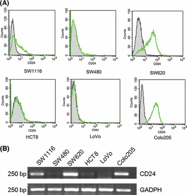 Expression of CD24 was cell type‐dependent in colorectal cancer cell lines. (A) Flow cytometric analysis of different colorectal cancer cell lines at the protein level. The cells were stained with anti‐CD24 monoclonal antibodies and FITC‐conjugated secondary antibodies. Abscissa, fluorescence intensity (log scale); ordinate, cell number (linear scale). Filled trace, background staining; open trace, staining with CD24. (B) Differentiated levels of CD24 mRNA were detected in colorectal cancer cell lines by RT‐PCR.