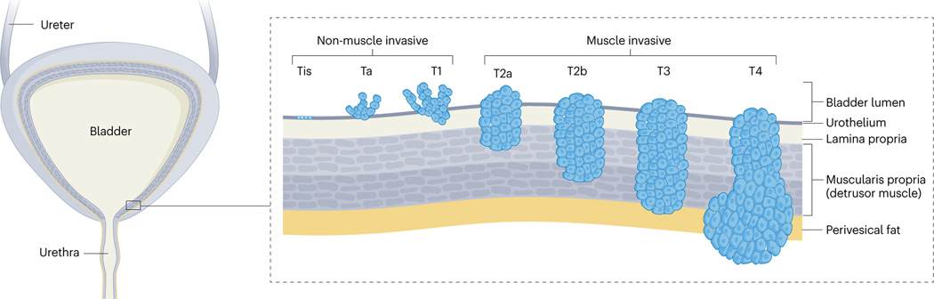 Bladder cancer can be categorized into grades, which is the cytological appearance of the urothelium, and stages, which are determined by the spread and depth of bladder wall invasion of the tumour. Non-invasive papillary carcinomas are classified as Ta disease, whereas urothelial carcinoma in situ is classified as Tis disease. All invasive urothelial cancers arise from either high-grade papillary carcinoma or urothelial carcinoma situ. Adapted from ref. 319, Springer Nature Limited.
