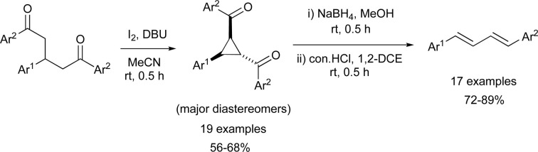 1-Aryl-2,3-diaroyl cyclopropanes, synthesized by iodine/DBU-mediated cyclization of 1,3,5-triaryl-1,5-diketones, when subjected to reduction followed by treatment with conc. HCl afforded E,E-1,5-diaryl-1,3-butadienes.