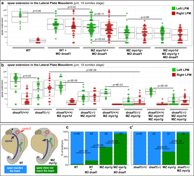 a, b Quantification of spaw extension in the Left (green dots) and Right (red dots) LPM of 18 somites stage LRO flow-deficient dnaaf1 morphant (a) or dnaaf1 mutant (b) embryos. myo1d/g loss of function causes a significant reduction of the antero-posterior extension of spaw expression in both the Left and the Right LPM. To allow direct comparison, mutant animals in a, b are derived from the same genetic background. Box plots in a, b indicate mean values ± SD. c, c′ Double in situ hybridization for spaw and the cardiac marker cmlc2/myl7 (see Supplementary Fig. 5 for pictures) reveals that spaw expression reaches the cardiac primordium in most WT control and LRO flow-deficient dnaaf1 morphant (c) or dnaaf1 mutant (c′) embryos, but fails to do so upon inactivation of myo1g. All p values were obtained using non-directional statistical tests. Complete numerical and statistical information for all experiments are provided in the Source Data files.