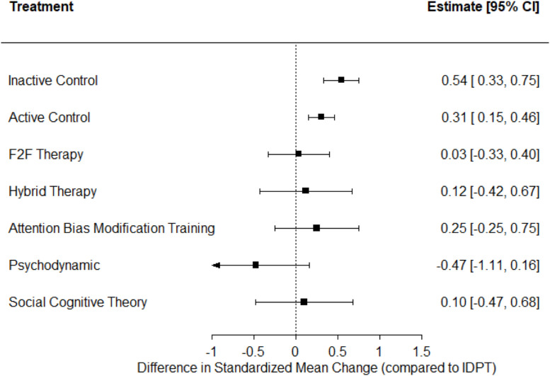 Fig. 1 presents a network graph with results for depression, and Fig. 2 shows a forest plot with the average effect sizes comparing IDPT with each of the alternative comparators. As shown in Fig. 1, IDPT vs active control was the most represented comparison, followed by IDPT vs inactive control. IDPT obtained the largest effect size when compared with inactive and active control groups (d+ = 0.54 and 0.31, respectively), reaching statistical significance in both cases. When IDPT was compared with the remaining comparators, a non-statistically significant average effect size was found: ‘Attention Bias Modification Training’ (d+ = 0.25), ‘Hybrid Therapy’ (d+ = 0.12), ‘Social Cognitive Theory’ (d+ = 0.10), and ‘Face-to-face Therapy’ (d+ = 0.03). When IDPT was compared with a group that applied psychodynamic therapy, the effect size favored the latter (d = −0.47), although not reaching statistical significance.