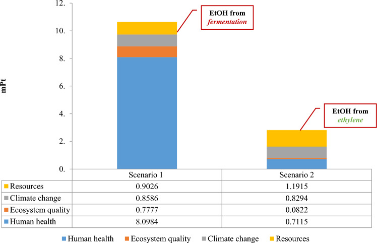 Therefore, since all the Damage Categories (DCs) were highlighted as mostly affected by Ethanol during the pectin extraction phase, a new analysis was carried out by replacing it. In detail, a comparison between two scenarios (i.e., Scenario 1—pectin extraction phase using ethanol from fermentation and Scenario 2—pectin extraction phase using Ethanol from ethylene) was carried out. Figure 5 shows the environmental impacts, making a comparison between the two considered scenarios by adopting Ethanol coming from different sources (i.e., fermentation and ethylene). The damage assessment showed that the environmental damages associated with the investigated scenarios are equal to 10.63 mPt and 2.81 mPt, respectively, for Scenario 1 and Scenario 2. Therefore, as highlighted in Fig. 5, Scenario 2 had a 73.4% lower impact than Scenario 1. In detail, the analysis of Fig. 5 reveals that the Impact Category (IC) most severely affected in Scenario 1, as already highlighted in Fig. 2, was Human Health (HH), with a total score of 8.0984 mPt. Transitioning to the second scenario, characterized using Ethanol produced from ethylene instead of fermentation-derived Ethanol, a significant reduction of 91.21% in this impact category was recorded, with the score decreasing from 8.0984 mPt to only 0.7115 mPt. In Scenario 2, the most significant damage category was Resource (R), highlighted by a single score of 1.1915 mPt, while the other DCs show variable values ranging from 0.08 to 0.82 mPt.