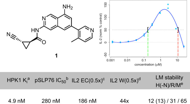 Initial lead compound 1: biochemical and cellular potency, including primary human T-cell IL2 assay, and liver microsome stability. aHTRF enzymatic assay (n > 2). bJurkat cell assay measuring phosphorylation of SLP76. cPrimary human T-cell assay measuring IL2 secretion after CD3/CD28 stimulation and compound treatment; IL2 EC(0.5×) = the concentration at which the response surpasses 50% of the response of a control compound (green dotted line). dIL2 W(0.5×) = the ratio of the concentration at which the response passes below 50% of the control compound (red dotted line) and the IL2 EC(0.5×). eLM = liver microsome predicted clearance (mL/min/kg), H = Human, R = Rat, M = Mouse, N = NADPH.