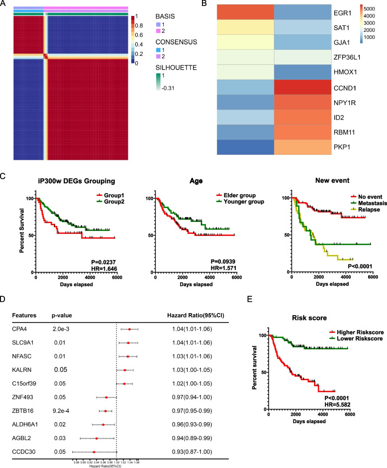 P300/CBP-related genes are linked to poor prognosis in patients with ES. A NMF clustering consensus map categorizing 142 ES patients into two distinct groups based on the expression patterns of iP300w-induced DEGs. B Heatmap illustrates the expression profiles of the top five genes from each group identified by NMF clustering. C Kaplan-Meier survival curves reveal significant differences in survival outcomes between the two patient groups identified through NMF clustering. Additional analyses include survival stratification by median age, as well as metastatic and relapse states. D Cox regression analysis presenting the top five and bottom five hazard ratio genes significantly associated with overall survival among the 74 identified genes. E The Lasso Cox regression model correlates gene expression with overall survival, assigning risk scores based on gene expression levels. Higher risk scores are identified as significant risk factors