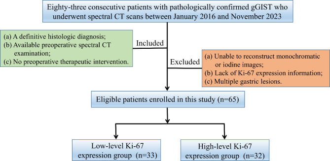 This retrospective study was approved by our Institutional Review Board, and the requirement of informed consent was waived. Eighty-three consecutive patients with gGIST who underwent spectral CT between January 2016 and November 2023 were enrolled. The inclusion criteria were: (a) definitive histological diagnosis, (b) availability of preoperative spectral CT examination within one week before the operation, and (c) no preoperative therapeutic intervention. The exclusion criteria were: (a) inability to reconstruct monochromatic or iodine images, (b) lack of Ki-67 expression information, and (c) presence of multiple gastric lesions. Seven patients were excluded due to the inability to reconstruct monochromatic or iodine images, five patients due to lack of Ki-67 expression information, and six patients due to multiple gastric lesions. Finally, 65 patients with gGIST constituted the study cohort. The patient flowchart is presented in Fig. 1.