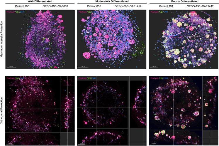 3D models provide the most information where 3D context and gene/protein expression can be related. However, thick specimens limit the diffusion of staining reagents and the penetration of light, in part due to the presence of lipids.31 We developed a non-destructive protocol for whole-mount IF that permits the penetration of antibodies and visualization up to ∼250 μm depth into the assembloid models (Figure 3A). We adapted this method from Dekkers et al.,32 using FLASH (fast light-microscopic analysis of antibody-stained whole organs) antigen retrieval from Messal et al.33 to improve antibody penetration and imaging depth for large models. The staining protocol takes 5 days, and stained specimens can be stored in clearing buffer at 4°C for >2 weeks prior to imaging. Briefly, excess collagen gel was dissected from the assembloids using needles, and we performed antigen retrieval using FLASH reagent 233 for 2 h at 37°C. This is an SDS and zwitterionic detergent-based method to remove tissue lipids and improve the reagent and light penetration through the specimen. To indirectly immunolabel co-cultures, we incubated with primary antibodies for 2 days at 4°C and then for a further 2 days with secondary antibodies and DAPI for nuclear counterstaining. To clear the assembloids for imaging, we immersed them for at least 30 min in fructose-glycerol clearing buffer32 (60% [v/v] glycerol and 2.5 M fructose, refractive index = 1.47) and then imaged them with a laser scanning confocal microscope. To demonstrate the utility of this method, we whole-mount-stained assembloids with anti-pan-cytokeratin and anti-vimentin to visualize both compartments in a native 3D context. Budding tumor structures visible by bright-field observation are revealed in detail when imaged by whole-mount IF, showing discrete pan-cytokeratin+ structures on the periphery of assembloids (Figure 3B; Videos S1, S2, and S3), with internal lumens in the well- and moderately differentiated assembloids and solid tumor masses in poorly differentiated co-cultures. Vimentin+ fibroblasts can be seen in close association with tumor acini, and areas of denser fibroblast presence are more apparent in maximum-intensity projections of whole-mount-IF-stained samples than in paraffin sections. The proliferation of cancer cells within assembloids became apparent when whole-mount staining with anti-Ki-67, with poorly differentiated assembloids having the greatest abundance of proliferating cells (Figure 4).