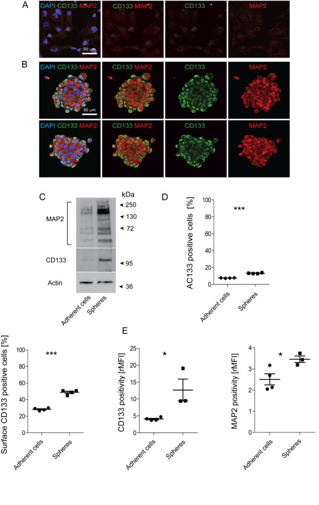 Based on these results, we investigated the expression levels of neural markers in DAOY cells at the protein level. We initiated our analysis with immunofluorescence staining, in which adherent DAOY cells and DAOY spheres were stained with antibodies against CD133 and MAP2 proteins three days after seeding. Using 0.5% Triton X-100 to permeabilize the cells, spheres with a diameter of 100–150 μm were stained uniformly and efficiently, showing good accessibility and penetration of the staining reagents. Confocal microscopy showed weak expression of both CD133 and MAP2 proteins in adherent cells, confirming our qRT-PCR results (Fig. 3A). In contrast, staining of DAOY spheres showed that the majority of cells were strongly stained with both CD133 and MAP2 antibodies (Fig. 3B). This heightened expression of both markers in the spheres was further corroborated by western blot analysis (Fig. 3C and Figure S4).