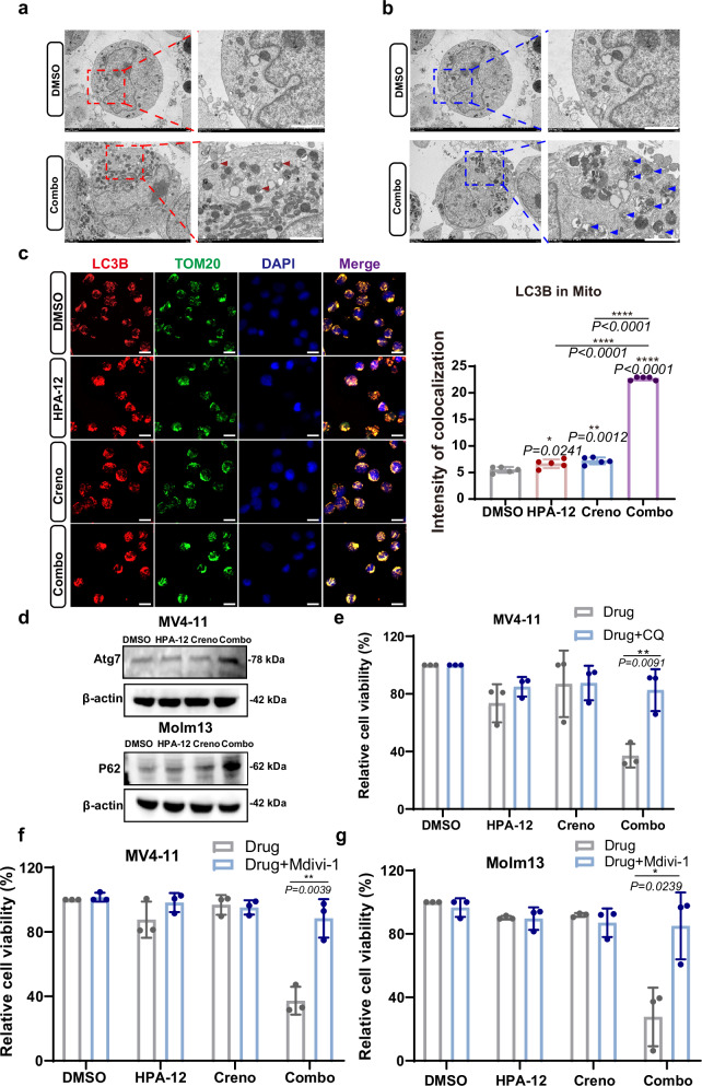 Interestingly, in the Combo group, we detected a significant increase in the number of mitochondria, although structural damage was evident (red arrow, Figs. 8a and S9b). We also observed typical autophagosomes engulfing damaged mitochondria (blue arrows), indicating the occurrence of mitophagy (Figs. 8b and S9c). Next, we investigated whether mitophagy played a role in the synergistic inhibitory effect of Combo treatment. We first verified the recruitment of LC3II to the mitochondria. Indeed, confocal microscopy revealed significantly increased colocalization of LC3II (red) and mitochondria (green) in the Combo group (Fig. 8c). WB confirmed the upregulation of the autophagy-related markers Atg7 and P62 (Fig. 8d). The autophagy inhibitor CQ partially reversed the decrease in cell viability in the Combo group (Fig. 8e). Most importantly, the mitophagy inhibitor Mdivi-1 partially but significantly rescued AML cells treated with Combo (Fig. 8f, g). Collectively, these data suggest that the combination of HPA-12 and Creno activates mitophagy to exert an inhibitory effect on AML.
