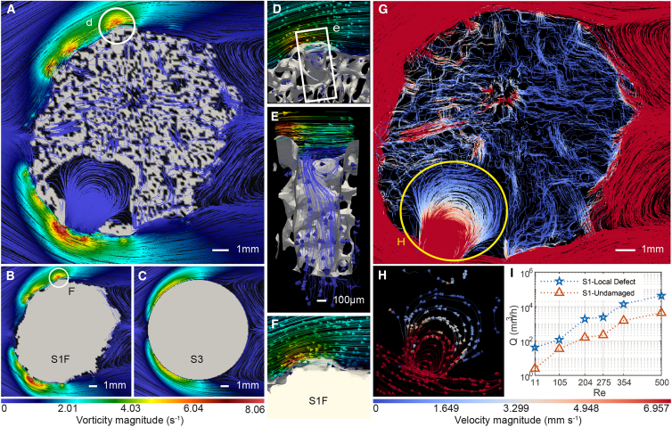 (A–C) Vorticity increases due to the surface roughness and internal pore space and flow in S1 compared with S1F where the skeleton pores of S1 were filled (further details shown in Figure S2B) and S3 with a “smooth” cylinder (a solid cylinder model (height = 4 cm, diameter = 1.23 cm)). Scale bar: 1 mm.