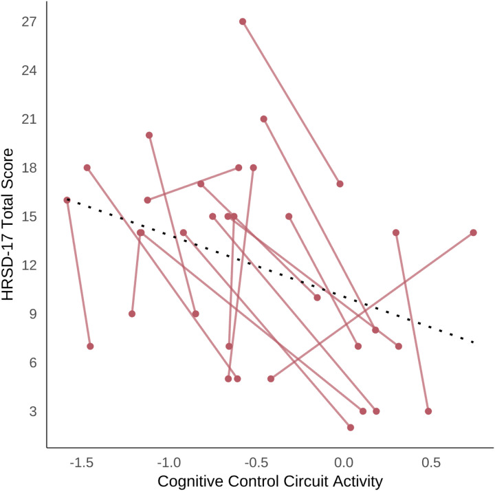 Cognitive control circuit (dACC) activation is shown on the x-axis and HRSD-17 total score is shown on the y-axis. A repeated measures correlation was significant with rrm=−0.593, P=0.009. Abbreviations: HRSD-17 = 17-item Hamilton Rating Scale for Depression; dACC = dorsal anterior cingulate cortex.