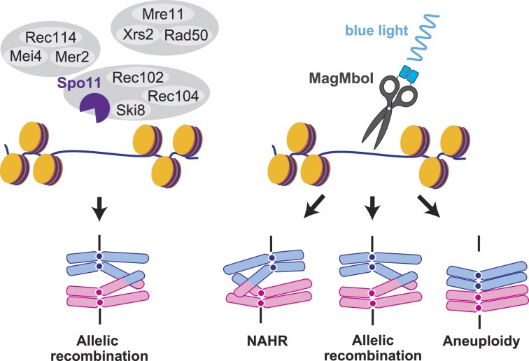 DNA double-strand breaks (DSBs) that occur in mitotic cells can induce chromosomal translocations (TLs), deletions (DELs), loss of heterozygosity (LOH) events, duplications (DUPs), and increasing genomic instability. On the other hand, DSBs during meiosis are formed only at limited sites called DSB hotspots during prophase I through complex mechanisms involving various meiosis-specific recombinases, including the DSB-forming protein Spo11. Moreover, recombinations induced during meiosis are mostly homologous recombinations (HRs) between homologous chromosomes, which are categorized into crossovers (COs) and noncrossovers (NCOs) [1–3]. In meiosis, TLs between different chromosomes and non-HRs between repetitive sequences such as ribosomal DNA (rDNA) and retrotransposable elements are suppressed at very low frequencies [4–6]. This maintains the stable composition of chromosomes in the gametes and is believed to prevent the occurrence of chromosomal abnormalities.
