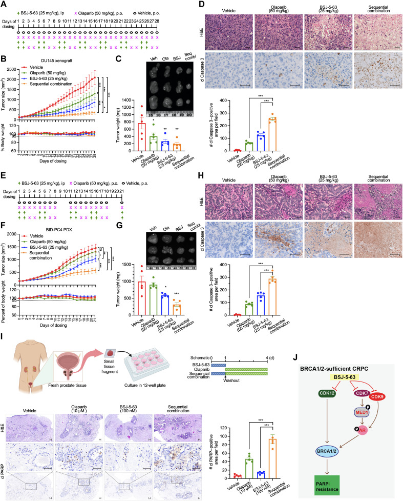 Furthermore, we used a newly developed BID-PC4 patient-derived xenograft (PDX) model, which lacks HRR deficiency. The key genomic alterations of BID-PC4 were determined by targeted exome sequencing (table S3). This model was insensitive to olaparib treatment, as evidenced by tumor growth in severe combined immunodeficient (SCID) mice. BSJ-5-63 demonstrated only a marginal inhibitory effect on tumor growth in this context (Fig. 7, E to G). Nevertheless, when the same sequential treatment approach was applied, combination therapy exerted a substantial inhibitory effect on tumor growth. Histological examination (H&E staining) revealed that the structure of PCa remained largely intact in the control and single-agent–treated groups, whereas the combination therapy led to massive apoptotic cell death, as evidenced by cleaved Caspase 3 staining (Fig. 7H). Last, we extended our findings by using short-term ex vivo cultures of three patient-derived prostate tumors obtained from radical prostatectomy. We observed significantly increased apoptosis in PCa tissues after sequential combination treatment with BSJ-5-63 followed by olaparib as indicated, compared to single-agent treatment, as evidenced by cleaved PARP1 staining (Fig. 7I and fig. S13).