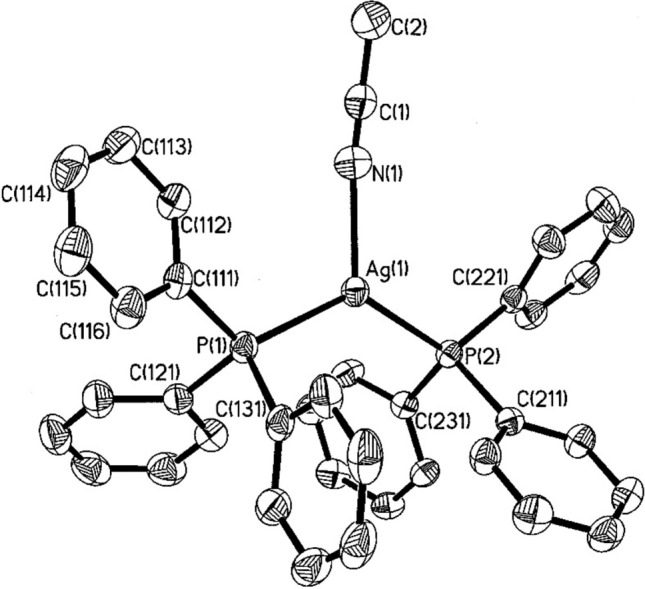 The typical preparation method for silver(I) complexes of the type [AgLnX] involves reacting stoichiometric amounts of a phosphine ligand with the appropriate silver(I) salt in a suitable solvent. For example, when silver(I) salts are reacted with monodentate tertiary phosphines in a 1:2 stoichiometric ratio, either monomeric complexes [AgX (PR₃)₂]/[Ag(PR₃)₂]·X or dimeric complexes [{AgX(PR₃)₂}₂] are generally formed. The outcome depends on factors such as the donor properties of the phosphine ligand, its bulkiness, substituents, and the donor properties of the anion [14, 20, 71]. Bachman et al. [72] report the preparation, isolation and crystallographic analysis of two new low-coordinate silver(I) complexes with triphenylphosphine, including the first structurally characterised two-coordinate phosphine complex of silver, [(Ph₃P)₂Ag]+ [72]. This complex was synthesised by reacting two equivalents of triphenylphosphine with silver tetrafluoroborate in acetonitrile, followed by recrystallisation from a mixture of dichloromethane and hexane [72]. This yielded colourless crystals of [(Ph₃P)₂AgNCCH₃][BF₄] (Fig. 2), as a dichloromethane solvate (I·0.5 CH₂Cl₂) with excellent yield. The resulting crystals were of sufficient quality for X-ray diffraction, allowing for direct structural confirmation. The unit cell contains eight pairs of cations and anions, along with four dichloromethane molecules positioned on two-fold axes. Although the solvent molecules do not form short contacts with the cations or anions, the ions are loosely associated with weak electrostatic interactions [72]. Elsewhere, Baranov et al. [73] report the synthesis of silver(I) complexes with tris[2-(2-pyridyl)ethyl]phosphine [73]. They showed that the coordination chemistry of tris[2-(2-pyridyl)ethyl]phosphine was first explored through reactions with Ag(I) and Au(I) salts [73]. Interaction with AgClO₄, AgNO₃, and AgOTf resulted in the formation of one-dimensional coordination polymers (CPs) of the type [Ag(L)X]ₙ (where X = ClO₄, NO₃, OTf), in which the ligand functions as a P,N, N'-bridging unit. When reacted with AgCl, this phosphine yields a CP, [Ag₄Cl₄(L)₂]ₙ, featuring stepped cubane-like [Ag₄Cl₄] modules, interconnected by “PyCH₂CH₂P” arms [73]. In the linear complex [Au(L)Cl], synthesised by treating the ligand (L) with Au(tht)Cl, the ligand coordinates in a P-monodentate manner [73].
