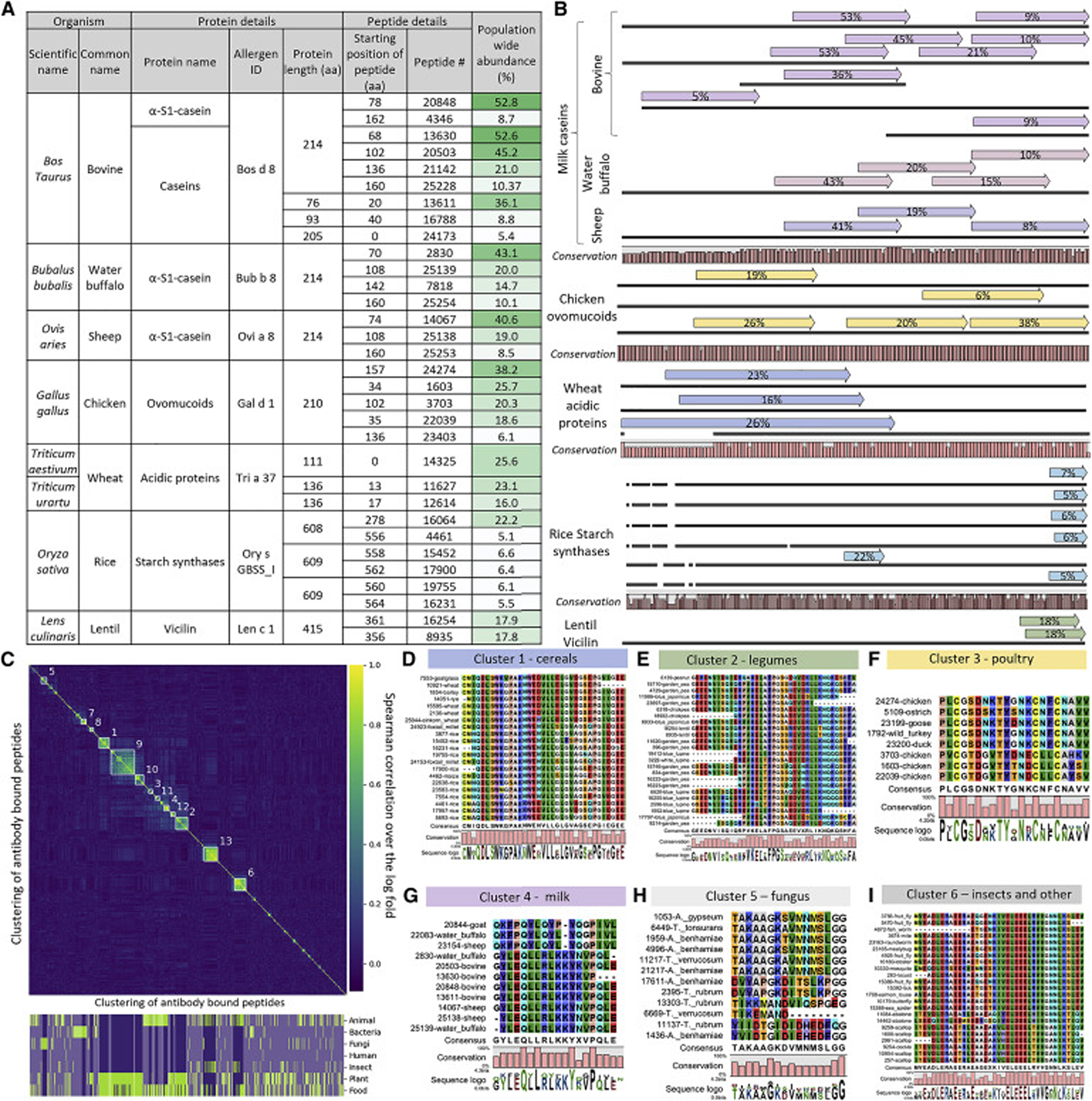 Given the similar antibody binding frequencies against food proteins from closely related phylogenetic origin (Fig. 2b), we next analyzed if these Ig responses are correlated between individuals. Hierarchical clustering (Fig. 2c) yielded 13 clusters, originating from both food proteins as well as environmental antigens. The clustering peptides typically shared sequence motifs, suggesting cross-reactivity against the same epitope (see sections of the motifs highlighted in Fig. 2d–i, Figure S 3 for full alignments, and Table S 2 for detailed information on the bound peptides).