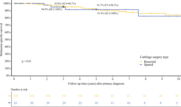 Melanoma-specific survival after primary diagnosis by cartilage surgery type
