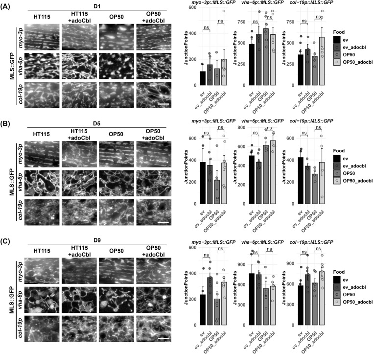Animals were grown on an HT115 or OP50 diet with or without the vitamin B12 analog adoCbl. Animals were grown on ev from the L1 stage and imaged during days 1, 5, 9, and 13 of adulthood. (A, B, C) Imaging was performed for MLS::GFP expressed in the (A) muscle, (B) intestine, and (C) hypodermis. All quantification was performed using mitoMAPR. Junction points are used here as an example measurement, and all mitochondrial measurements measured by mitoMAPR are available in Table S1. ns = not significant using a Wilcoxon signed-rank test.