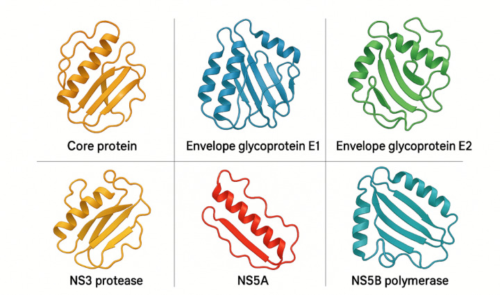 The non-structural proteins NS3, NS5A, and NS5B play crucial roles in viral replication and have been extensively studied as drug targets. The NS3 protease domain exhibited a chymotrypsin-like fold with a catalytic triad consisting of His57, Asp81, and Ser139. The substrate-binding pocket and the allosteric site were identified as potential sites for inhibitor binding. The NS5A protein displayed an intrinsically disordered nature, with three distinct domains separated by low-complexity sequences. The domain I of NS5A was predicted to have a zinc-binding motif and a potential RNA-binding site, making it an attractive target for antiviral development. The NS5B RNA-dependent RNA polymerase adopted a right-hand structure with fingers, palm, and thumb subdomains. The active site and the allosteric binding pockets were recognized as promising sites for inhibitor design.