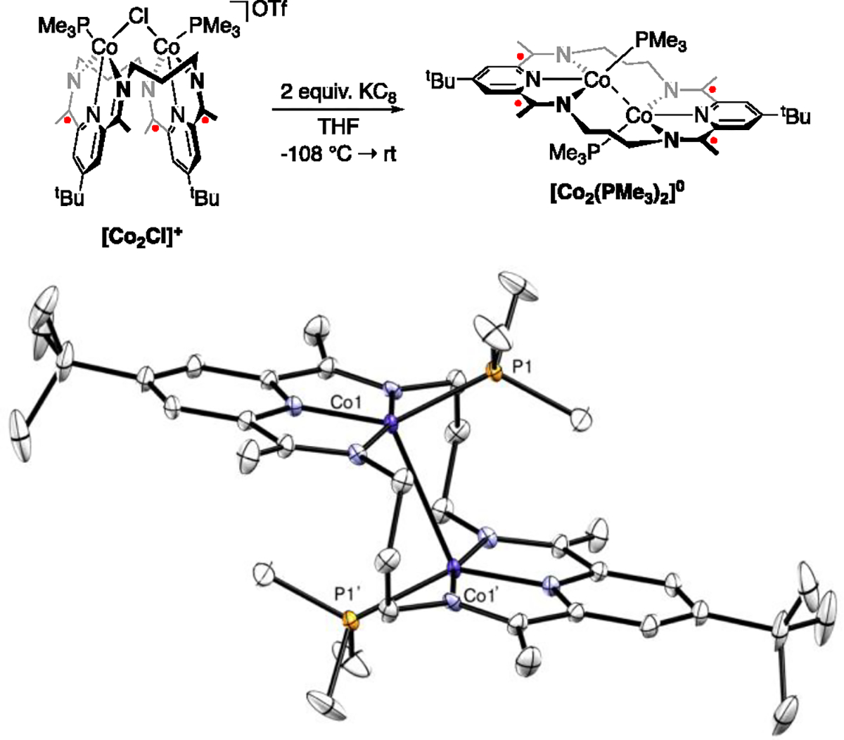 Top: Scheme showing the initial procedure used to make [Co2(PMe3)2]0. Bottom: Thermal ellipsoid plot (50 % probability level) from a crystal structure of [Co2(PMe3)2]0. All hydrogen atoms were removed for clarity. Symmetry generated atoms are labeled with (‘). Symmetry code: 1-X, +Y, 1-Z. Selected bond lengths: Co1–Co1’ = 2.957(1) Å, Co1–P1 = 2.231(1) Å, Co1–N2(py) = 1.823(4) Å.