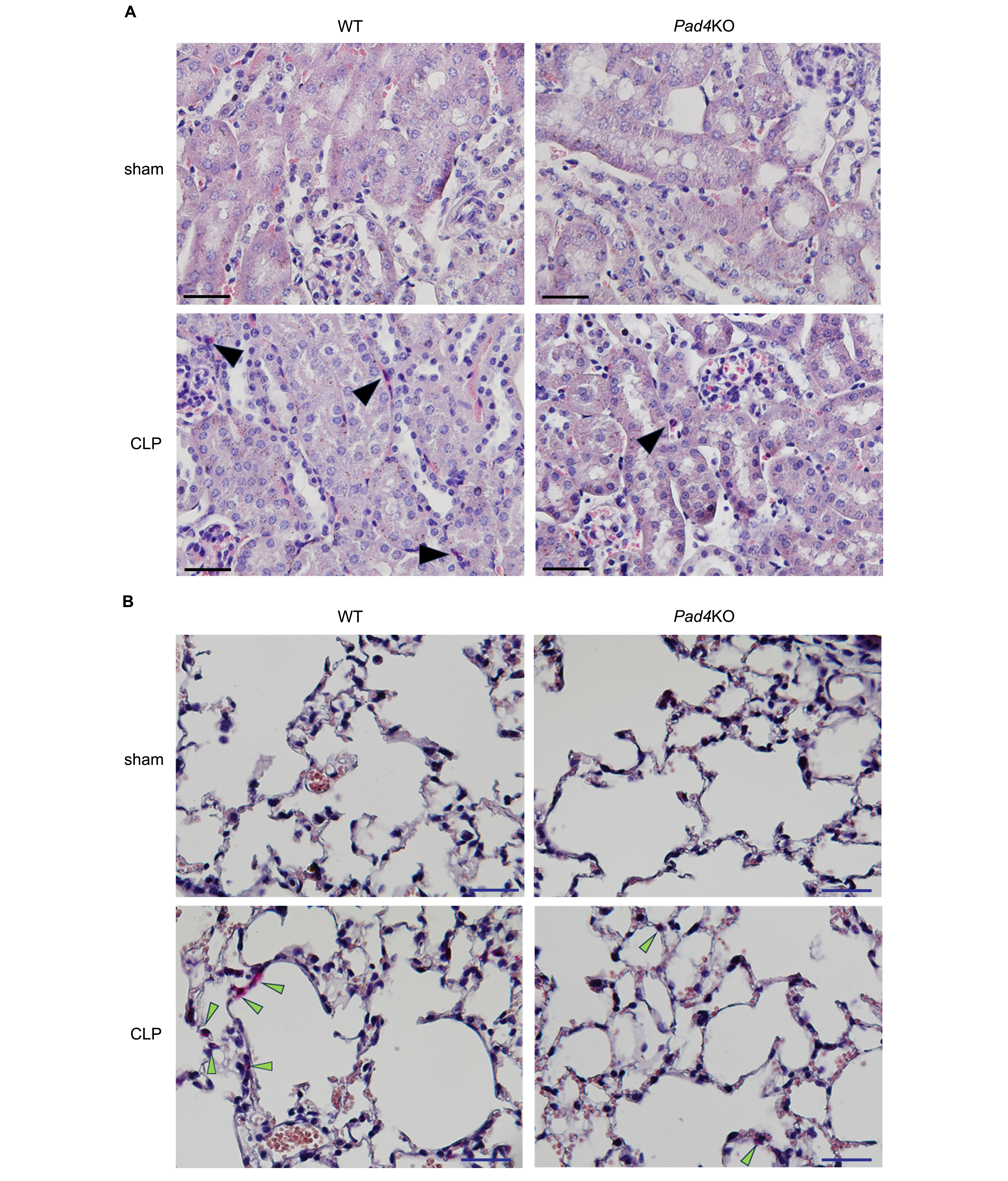 Several limitations exist in this study. First, we utilized mice with systemic Pad4 knockout. PAD4 is expressed not only in neutrophils but also in other immune cells like eosinophils, monocytes, macrophages, and natural killer cells39. Furthermore, extracellular traps are known to occur not only on neutrophils but also on mast cells, eosinophils, basophils, and monocytes/macrophages40, 41. Although the large majority of immune cells in the peritoneal cavity after CLP were neutrophils, the extracellular traps in our experiments may have included extracellular traps derived from these immune cells other than neutrophils. Given the use of whole-body Pad4KO mice, we cannot ascertain if the effect stems from neutrophil PAD4. To address this, we conducted adoptive transfer of purified neutrophils from WT to Pad4KO mice, indicating the significance of intraperitoneal neutrophil PAD4 in the inflammation/injury pathogenesis in remote organs. Secondly, PAD4 has other effects beyond its critical role in NET formation. It mediates apoptosis, inflammation, and pluripotency39. PAD4 promoted thrombin activity via antithrombin inactivation in rheumatoid arthritis42. The function of PAD4 other than NET formation might contribute to the beneficial effect of knockout of Pad4 on our CLP model. Another limitation is interspecies differences in NET formation. Human neutrophils form NETs more readily than mouse neutrophils6, 43, 44. This implies that NETs might more likely form in peripheral blood or distant organs in humans than in mice. Further research is necessary to understand the role of local NET formation to distant organ injury via local IL-17A and remote CXCL-1/ CXCL-2 in humans.