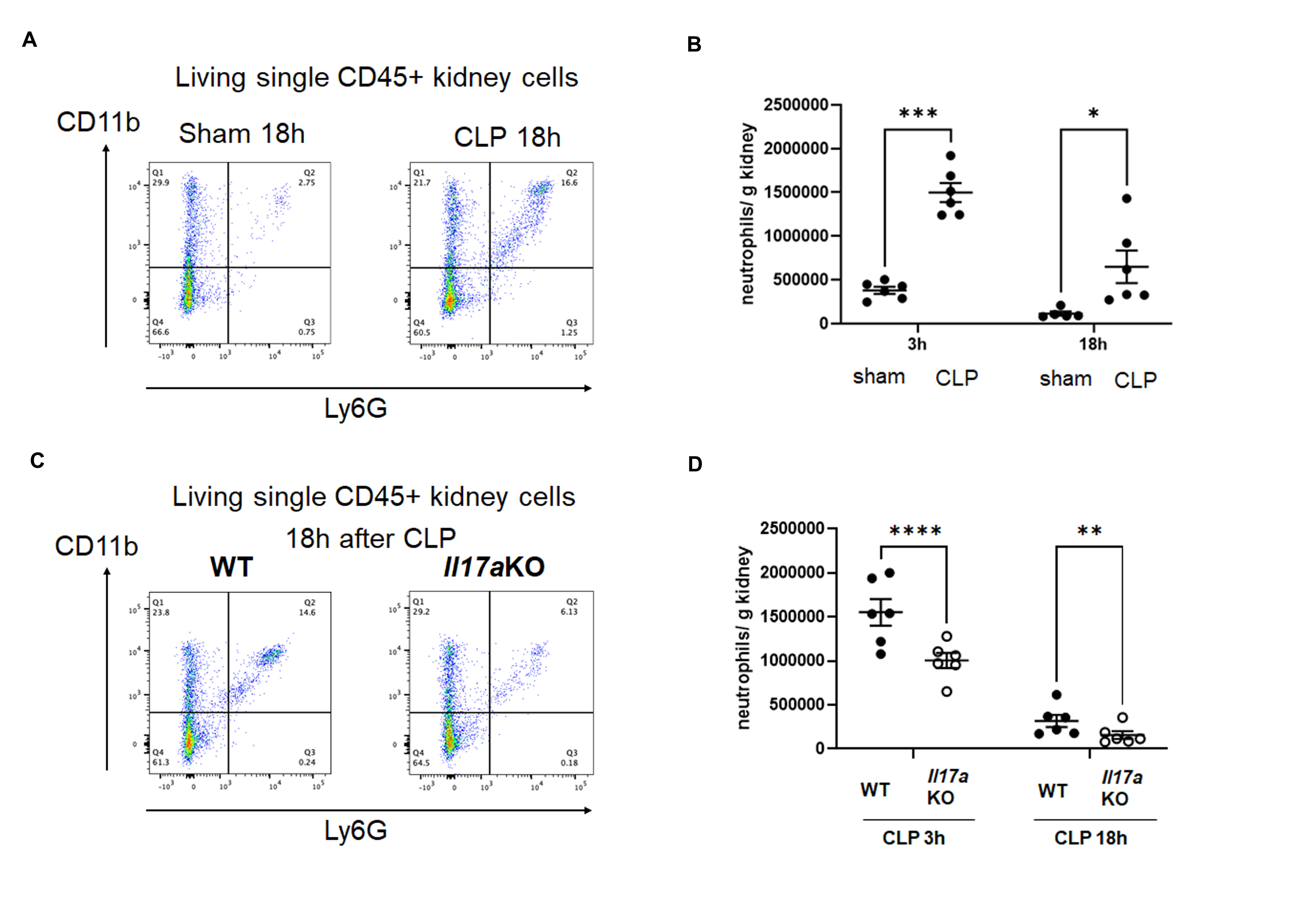 We then investigated the mediator(s) from NETs circulating systemically causing organ injury. Pad4 knockout reduced IL-17A in PLF and plasma after CLP. Interestingly, a myeloid-specific Pad4 deletion greatly reduced IL-17A in an atherosclerosis model19. Furthermore, Pad4 and Il-17a knockout notably reduced CXCL-1 and CXCL-2 levels in lung and kidney and decreased neutrophil infiltration. This indicates IL-17A, promoted by NET formation, is vital for CXCL-1, CXCL-2 production, and neutrophil infiltration in distant organs post-CLP. IL-17A stimulates epithelial cells to produce chemokines, and promotes myeloid cell mobilization to inflammatory sites20. Notably, CXCL-8 in humans and its functional homologs, CXCL-1 and CXCL-2 in mice, are potent inducers of neutrophil migration into inflamed tissues34. Il-17a knockout reduces CXCL-1 and − 2 levels, neutrophil infiltration, and kidney impairment after CLP35. Thus, IL-17A plays a crucial role in distant organ CXCL-1/CXCL-2 production and neutrophil infiltration.