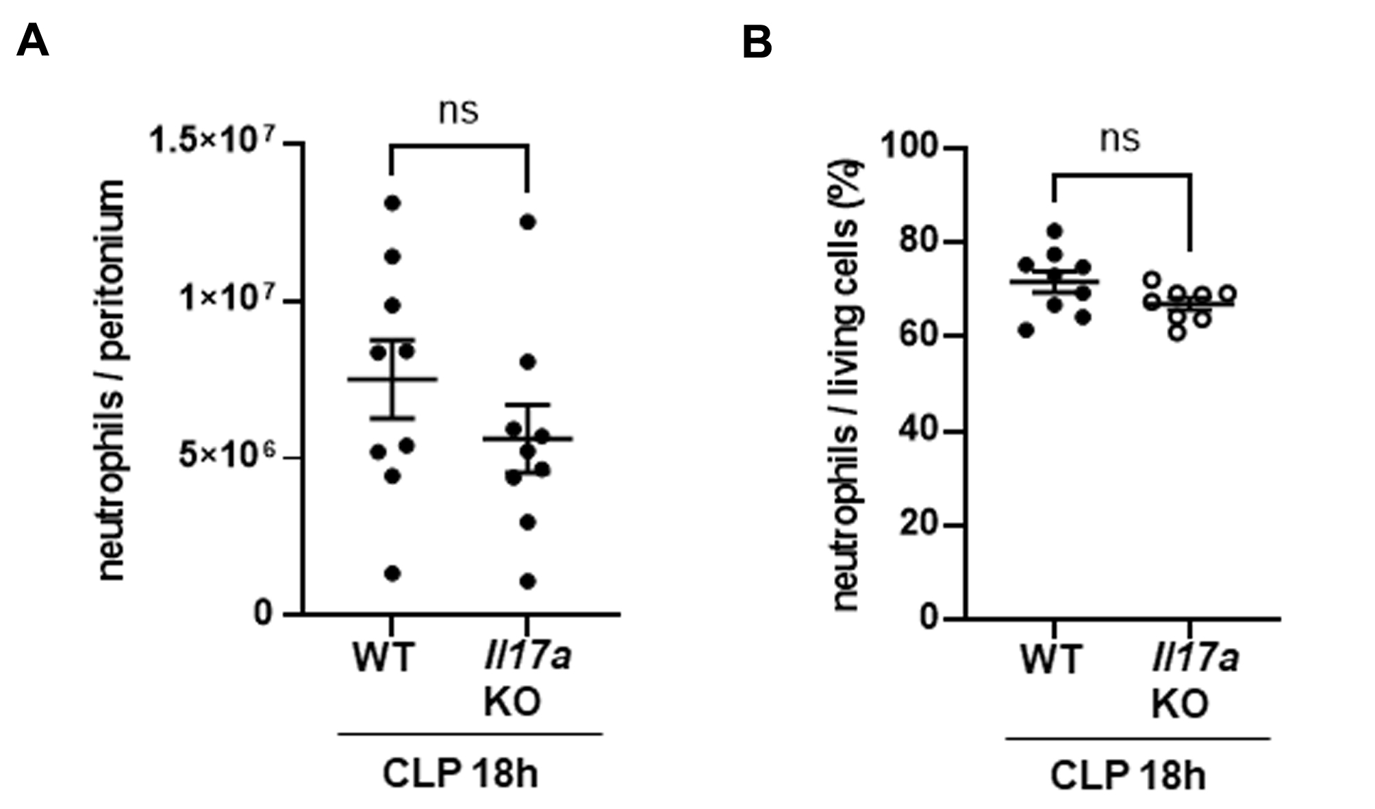 In PLF and plasma, CXCL-1 and − 2 levels were upregulated 18 h after CLP in WT mice, whereas these levels were significantly decreased in Il-17aKO mice (Fig. 5A and B). Knockout of Il-17a did not significantly alter the absolute number or percentage of neutrophils infiltrating into the peritoneal cavity 18 h after CLP (Supplemental Fig. 7). However, H3Cit levels in PLF, which were elevated 18 h after CLP in WT mice, were significantly decreased in PLF from Il-17a KO mice (Fig. 5C).