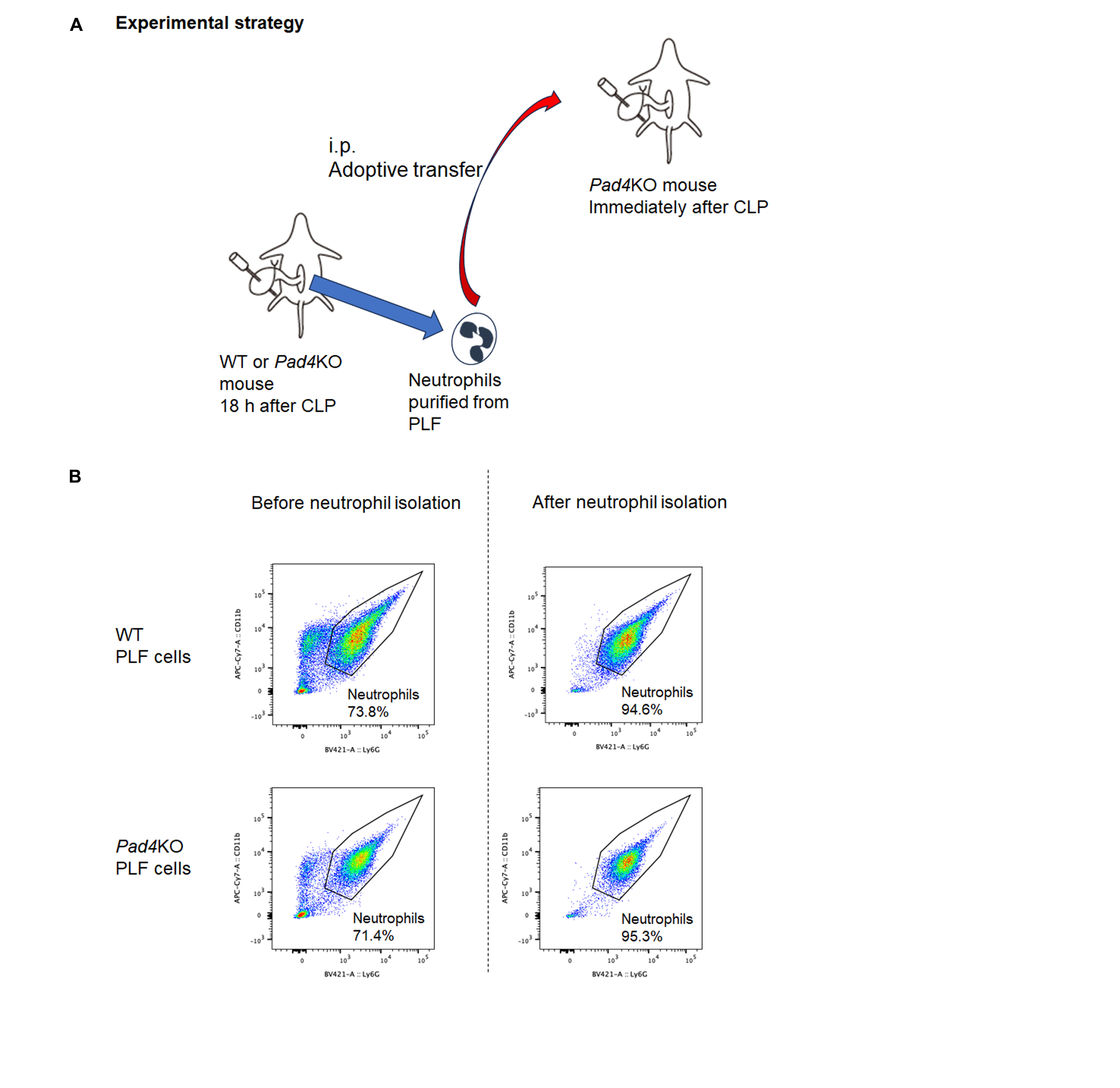 Male or female WT or Pad4KO mice (9–12 weeks old) underwent CLP surgery. PLF was collected at 18 h post-CLP. Neutrophils from PLF were purified using a mouse Neutrophil Isolation Kit (Miltenyi Biotec GmbH, Bergisch-Gladbach, Germany), labeled with anti-mouse Ly6G Pacific Blue and anti-mouse CD11b APC/Cy7 antibodies, and analyzed via flow cytometry (~ 95% pure Ly6G + CD11b + cells; Supplementary Fig. 4B). Neutrophils were counted using Countess II (Invitrogen, Carlsbad, CA). Neutrophils (106) were intraperitoneally injected into Pad4KO mice immediately after CLP. Mice were euthanized 18 h post-CLP, and tissue specimens, blood, and PLF were harvested.