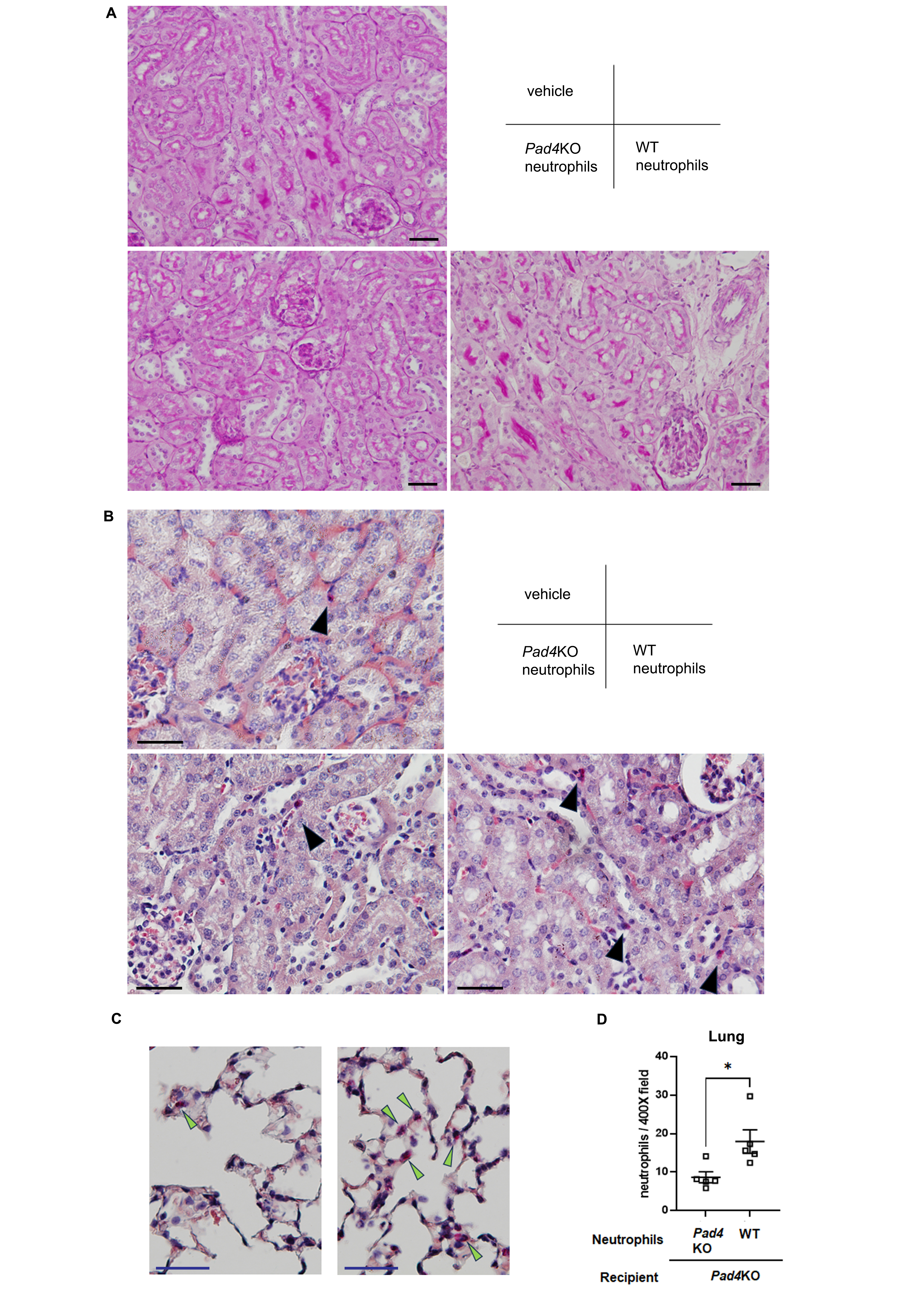 Intraperitoneal adoptive transfer of WT neutrophils counteracted the attenuation of septic AKI, neutrophil infiltration into kidney, IL-17A production in PLF and plasma, CXCL-1/CXCL-2 production in kidney and lung caused by knockout of Pad4. (A) Plasma BUN levels in Pad4KO mice at 18 h after CLP surgery injected with WT (n = 12) or Pad4KO (n = 7) neutrophils, or vehicle (n = 5). (B) Tubular damage score in kidney cortex in Pad4KO mice at 18 h after CLP surgery injected with WT (n = 12) or Pad4KO (n = 7) neutrophils, or vehicle (n = 5). (C) Number of neutrophils in kidney of Pad4KO mice at18 h after CLP surgery injected with WT (n = 12) or Pad4KO (n = 7) neutrophils, or vehicle (n = 5) using naphthol AS-D chloroacetate esterase staining. Neutrophils were counted in ×400 fields and averaged per mouse. (D, E) CXCL-1 and −2 concentration in kidney (D) and lung (E) of Pad4KO mice at 18 h after CLP surgery injected with WT (n = 9) or Pad4KO (n = 7) neutrophils, or vehicle (n = 5). (F, G) IL-17A concentration in (F) PLF and (G) plasma of Pad4KO mice at 18 h after CLP surgery injected with WT (n = 12) or Pad4KO (n = 7) neutrophils, or vehicle (n = 5). The data sets were analyzed by one-way ANOVA, followed by Tukey’s multiple comparisons test. Values represent the means ± SEM. ns: not significant, *P < 0.05, **P < 0.01, *** P < 0.001. Scale bars = 20 μm.