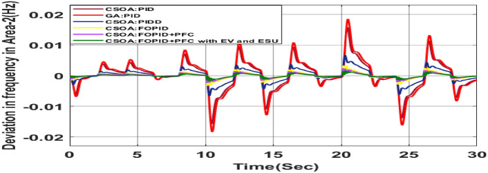 To test the feasibility of CSOA-optimized combined FOPID and PFC with hybrid ESS for a reorganized T-G-S system. Its performance is compared with CSOA-FOPID + PFC, CSOA-FOPID, CSOA-PIDD, CSOA-PID, and GA-PID controllers.