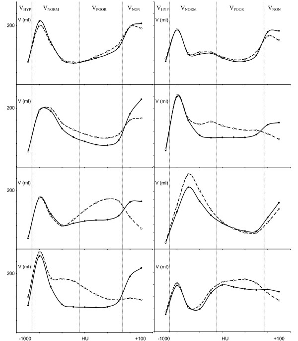 Distribution of differently aerated lung volumes. Individual curves for eight animals before (solid line) and after (dashed line) a recruitment maneuver. Multi-slice CT of the whole lung with characterization of lung parenchyma according to Hounsfield units at end-expiration. VHYP, volume of hyperinflated lung parenchyma; VNON, volume of nonaerated lung parenchyma; VNORM, volume of normally aerated lung parenchyma; VPOOR, volume of poorly aerated lung parenchyma.