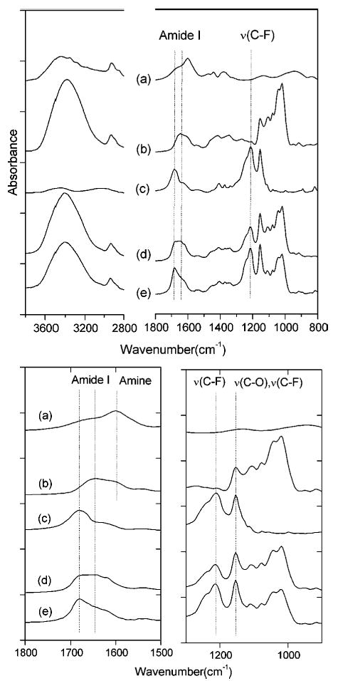 Graft polymers with either hydrophobic fluorocarbon branches or hydrophilic dextran branches were synthesized, as well the complete fluorocarbon surfactant polymer. PVAm-FC11 was prepared by reacting the amine groups of PVAm with N-(perfluoroundecanoyloxyl)succinimide in methanol. The reaction of succinimide with amine is selective, so that hydroxyl groups on dextran do not need protection. PVAm-FC11 was insoluble in methanol and has poor solubility in most common solvents. The appearance of the amide I and II, ν(–CF3), and ν(–CF2–) indicates new amide bond formation, as shown in Figure 1c. A weak shoulder around 1590 cm−1 is attributed to un-reacted amino groups. It is interesting to note that the amide I peak of PVAm-FC11 was shifted to higher wavenumber (1681 cm−1) compared with the amide I (~1643 cm−1) for surfactants with hydrocarbon branches. This shift may be caused by the strong inductive effect of the perfluorocarbon chain. Similar shifts also have been reported for small fluorocarbon molecules such as trifluoroacetamide, in which the amide I absorbance appears at 1709 cm−1.31